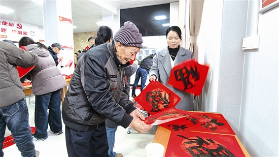 2月3日,在靈寶市五畝鄉(xiāng)龍祥新村,書法家現(xiàn)場揮毫潑墨,為易地搬遷群眾送“福”。 尚棟 攝