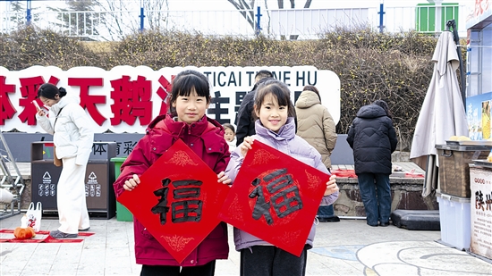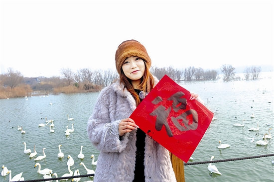 1月31日,在三門峽天鵝湖國家城市濕地公園,小游客拿著剛寫好的福字,新年氛圍感滿滿。 尚棟 攝
