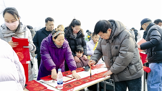 1月31日,在三門峽天鵝湖國家城市濕地公園,書法家為往來游客書寫、贈送春聯(lián)。 尚棟 攝