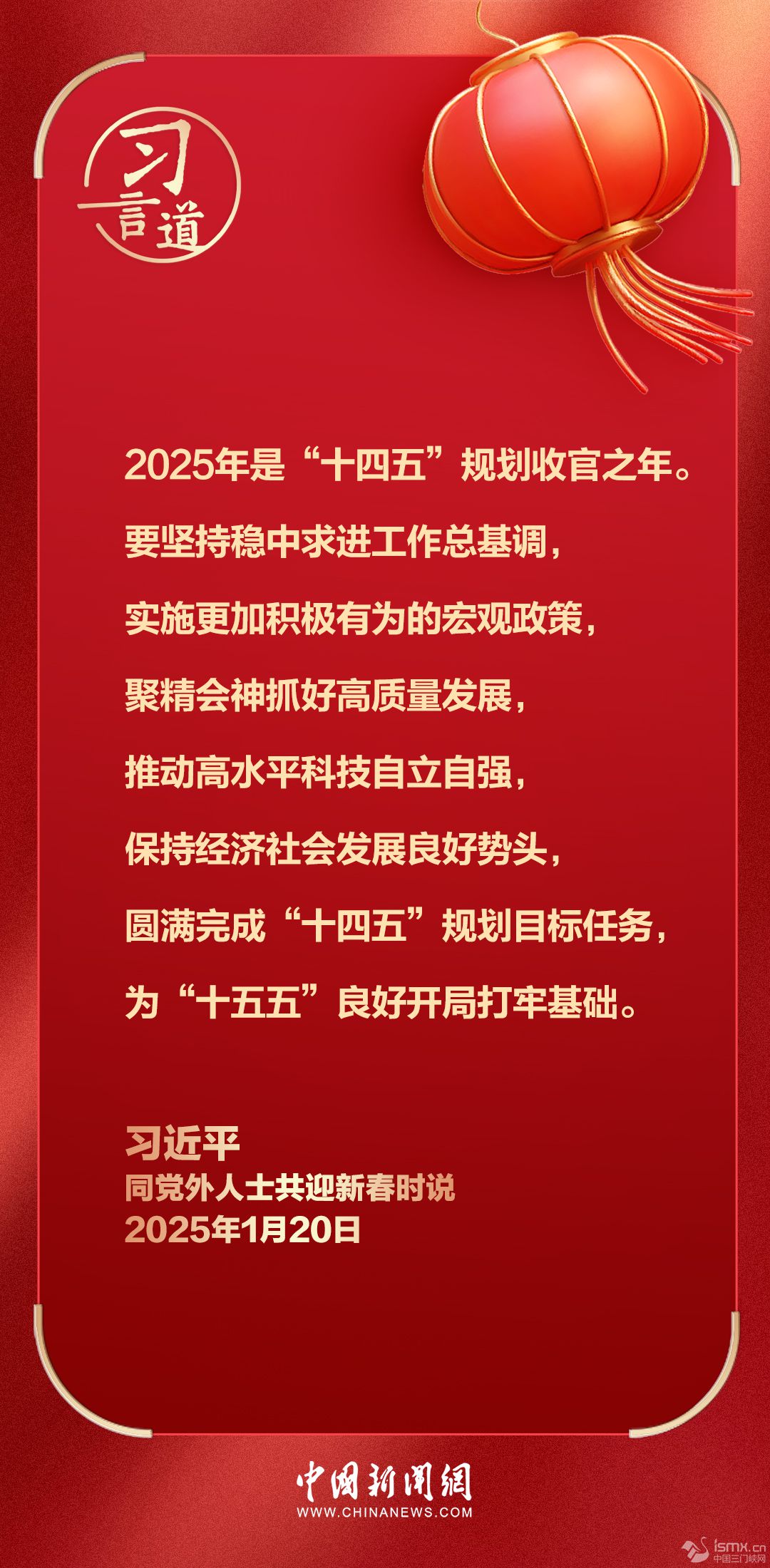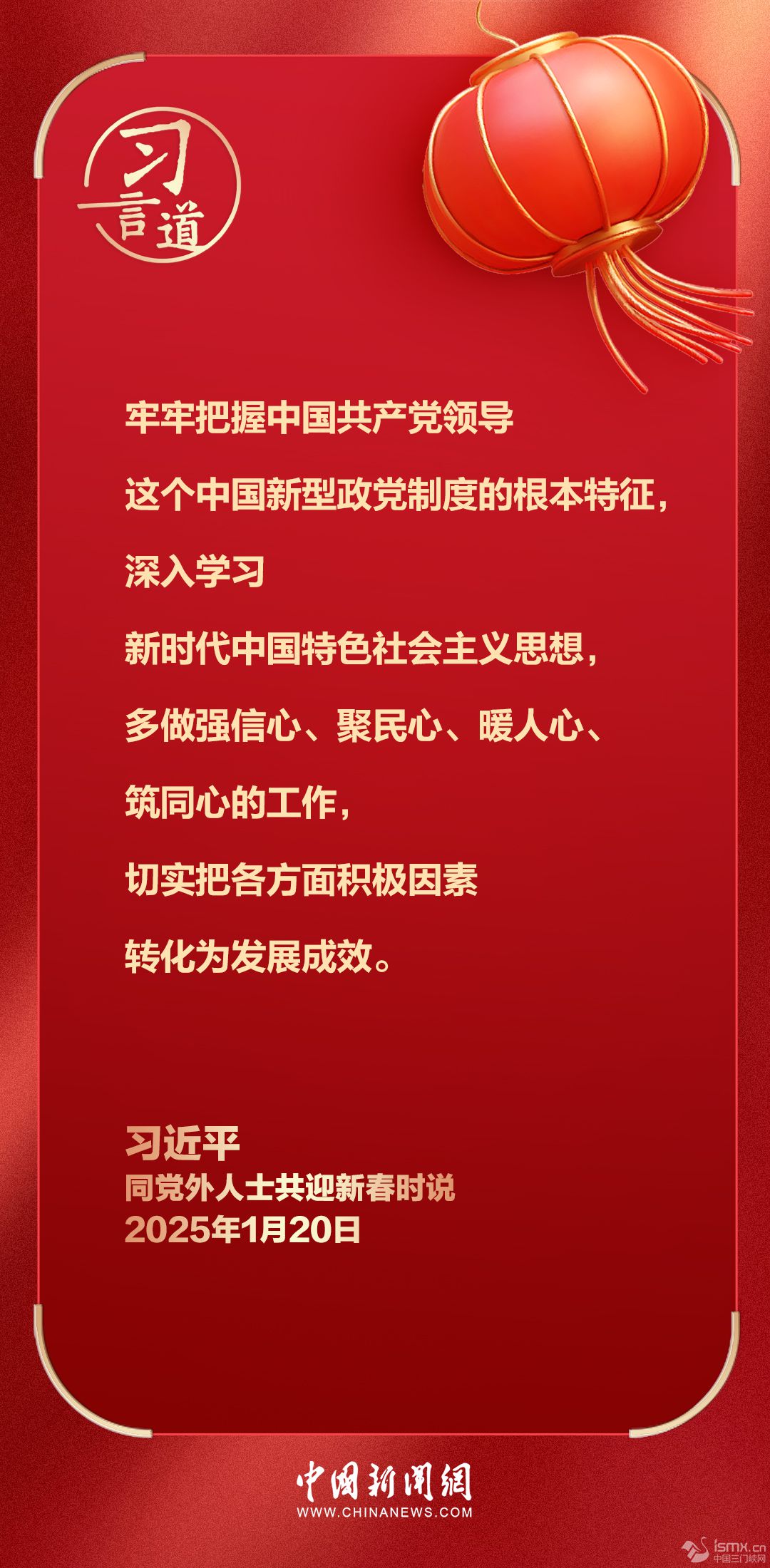 | 在中華民族傳統(tǒng)節(jié)日乙巳蛇年春節(jié)即將到來之際,中共中央總書記、國家主席、中央軍委主席習(xí)近平20日在人民大會(huì)堂同各民主黨派中央、全國工商聯(lián)負(fù)責(zé)人和無黨派人士代表歡聚一堂,共迎佳節(jié)。習(xí)近平代表中共中央,向各民主黨派、工商聯(lián)和無黨派人士,向統(tǒng)一戰(zhàn)線廣大成員,致以誠摯問候和新春祝福。