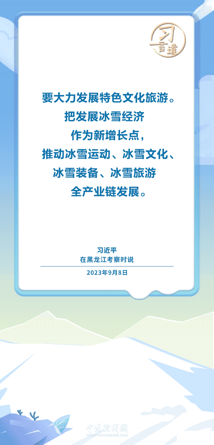 習(xí)近平總書記高度重視寒地冰雪經(jīng)濟發(fā)展,多次作出重要指示批示,強調(diào)把發(fā)展冰雪經(jīng)濟作為新增長點,推動冰雪運動、冰雪文化、冰雪裝備、冰雪旅游全產(chǎn)業(yè)鏈發(fā)展。