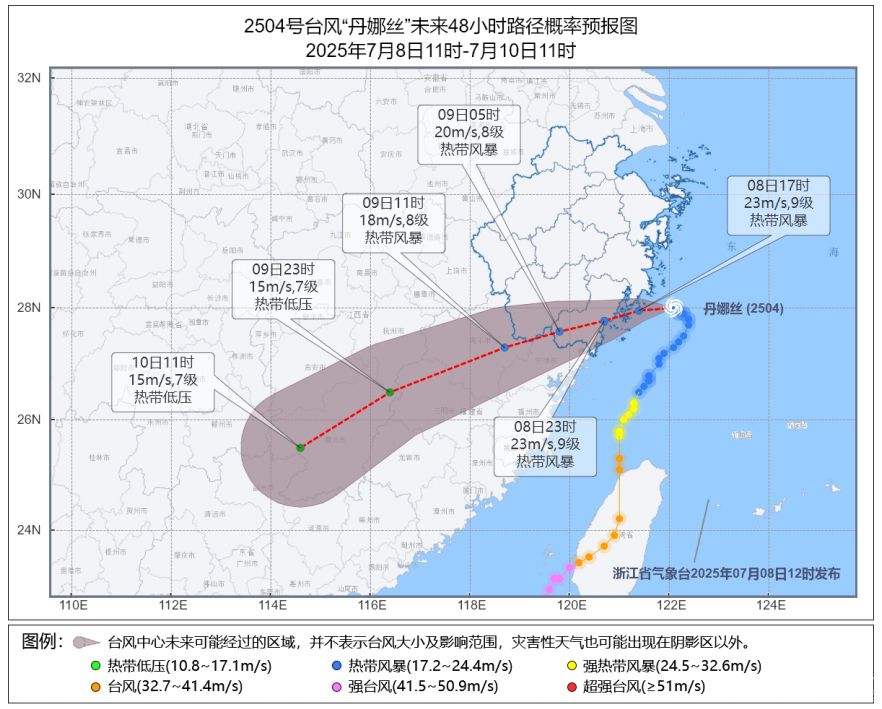 浙江省氣象部門預(yù)計,臺風(fēng)“丹娜絲”將于今天傍晚到夜間在臺州到寧德一帶沿海登陸(最大可能在溫嶺到霞浦),登陸時強度為熱帶風(fēng)暴級或強熱帶風(fēng)暴級(9~10級,23~28米/秒)。