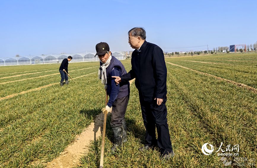 茹振鋼給村民李安明講解春季田間管理要點。人民網 辛靜攝