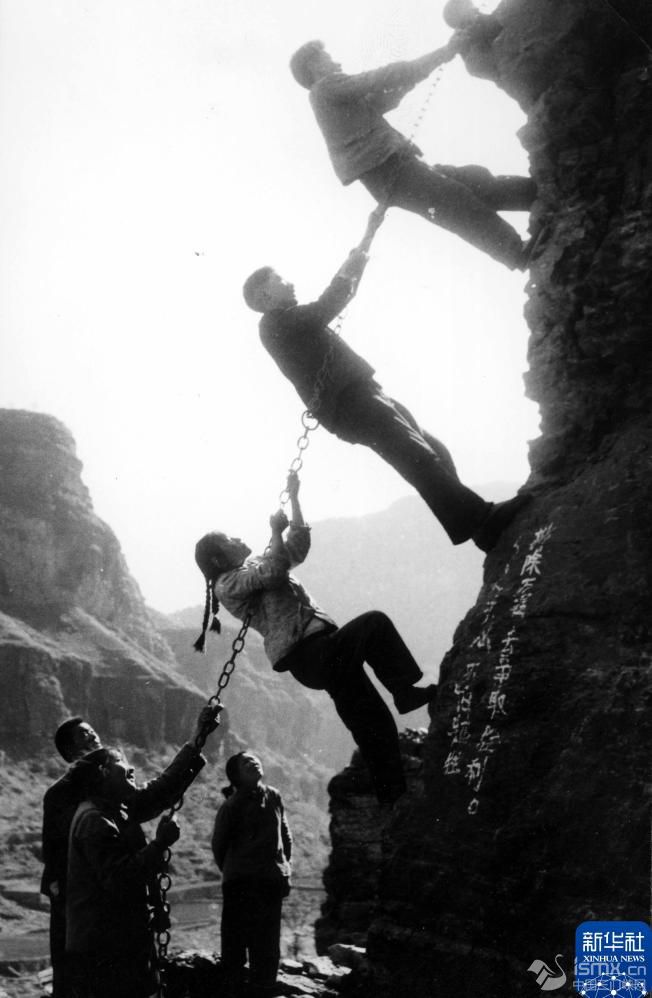 人們在紅旗渠施工現(xiàn)場凌空除險(資料照片)。新華社發(fā)