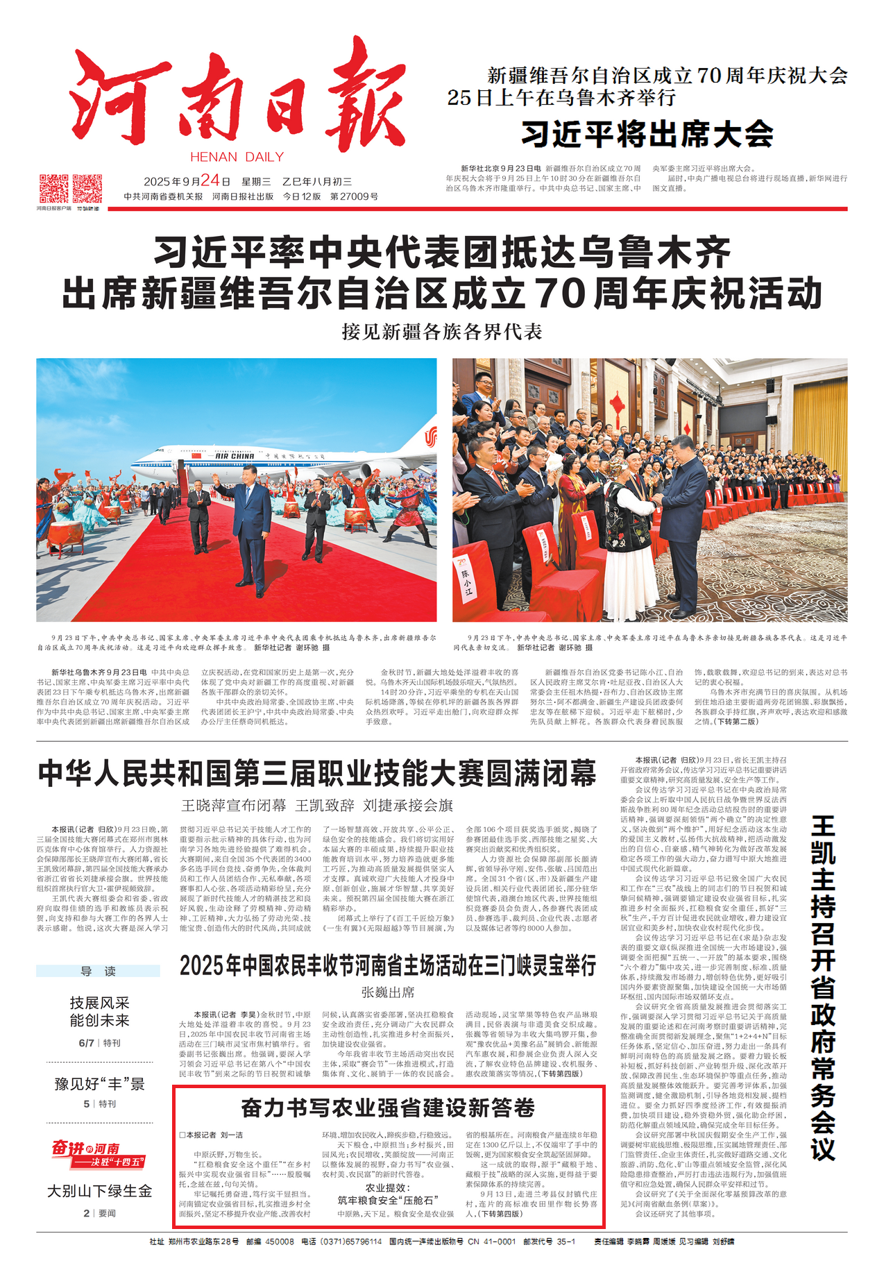 河南正扛穩(wěn)使命勇奮進(jìn) 牢記殷殷囑托 錨定農(nóng)業(yè)強(qiáng)省目標(biāo)推進(jìn)鄉(xiāng)村振興 農(nóng)業(yè)提效筑根基 糧食安全有保障 產(chǎn)量連續(xù) 8 年超 1300 億斤 高標(biāo)準(zhǔn)農(nóng)田達(dá) 8808 萬畝 約占全省耕地總面積的78% 藏糧于地、藏糧于技深入實(shí)施 走進(jìn)蘭考縣儀封鎮(zhèn)代莊村,連片的高標(biāo)準(zhǔn)農(nóng)田里作物長勢(shì)喜人,種糧大戶牛煜會(huì)正拿著手機(jī)查看田間墑情監(jiān)測(cè)數(shù)據(jù),“這2000畝地全部實(shí)現(xiàn)了高標(biāo)準(zhǔn)改造,每50畝配套一眼機(jī)井,還安裝了智能滴灌和物聯(lián)網(wǎng)墑情儀,動(dòng)動(dòng)手指就能澆地。” 19.6 萬家合作社 27.5 萬家家庭農(nóng)場(chǎng)激活效能 滑縣煥永種植農(nóng)民專業(yè)合作社“全程機(jī)械化+綜合農(nóng)事服務(wù)”模式覆蓋周邊10余個(gè)鄉(xiāng)鎮(zhèn),年機(jī)械化服務(wù)面積5萬畝次。合作社理事長杜煥永自豪地說:“我們提供耕種管收全流程服務(wù),既降低了成本,又通過科學(xué)管理提高了糧食產(chǎn)量。” 耕種收機(jī)械化率居全國前列 從 “糧倉” 到 “油庫”“肉庫” 供給從 “吃飽” 向 “吃好” 升級(jí) 農(nóng)村提質(zhì)美家園 宜居宜業(yè)暖人心 光山縣文殊鄉(xiāng)東岳村,曾經(jīng)“土坯房連片、晴天一身土、雨天一身泥”的景象早已不見,如今村內(nèi)道路全部硬化,路燈照亮每條街巷。村民崔紅梅感慨道:“現(xiàn)在出門能坐公交,在家能連5G網(wǎng)絡(luò),跟城里生活沒啥兩樣。” 基礎(chǔ)設(shè)施完善 既便利村民生活 更帶動(dòng)鄉(xiāng)村產(chǎn)業(yè) 東岳村鴨蛋、大米等經(jīng)電商進(jìn)城 稻田小火車、花鼓戲展演年引上萬游客 如今,東岳村旅游產(chǎn)業(yè)年收入達(dá)1300萬元 長葛崗李村的美靠村民自覺 學(xué)村規(guī)、推文明積分制 守硬件育新風(fēng) 正是河南學(xué)用 “千萬工程” 建和美鄉(xiāng)村的縮影 農(nóng)民增收強(qiáng)底氣 變身振興 “主人翁” 走進(jìn)西峽縣桑坪鎮(zhèn)三灣村,余澤基的香菇大棚里整齊排列的菌棒上,一朵朵香菇長勢(shì)喜人。“以前種地靠天吃飯,一年忙到頭也剩不下幾個(gè)錢。”余澤基說,“后來村里推廣香菇種植,合作社提供菌棒、技術(shù),我試著建大棚,沒想到效益這么好。種香菇讓我們一家走上了致富路。”如今,他已成為當(dāng)?shù)氐姆N植能手,每年凈收入超過9萬元。 西峽縣的香菇產(chǎn)業(yè) 正是河南推動(dòng)“一縣一業(yè)”“一村一品”的縮影 “龍頭 + 合作社 + 農(nóng)戶” 拓富路 2024 年農(nóng)村居民人均可支配收入達(dá) 21330 元 城鄉(xiāng)差距縮小 技能培訓(xùn)提升“發(fā)展力” 全年培訓(xùn) 35.5 萬農(nóng)民 實(shí)現(xiàn)從 “靠體力” 到 “憑技能” 的轉(zhuǎn)變 征程萬里風(fēng)正勁 重任千鈞再出發(fā) 河南正繪就 “三農(nóng)” 新圖景!