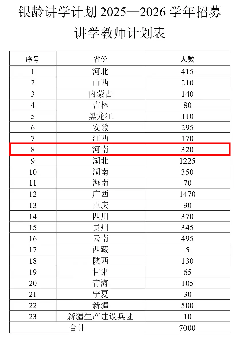 河南今年將招募 320名退休教師! 近日,教育部、財(cái)政部發(fā)布關(guān)于做好2025年銀齡講學(xué)計(jì)劃有關(guān)實(shí)施工作的通知,計(jì)劃在2025年義務(wù)教育階段招募7000名講學(xué)教師,旨在充分利用退休教師專業(yè)優(yōu)勢(shì)、經(jīng)驗(yàn)優(yōu)勢(shì),加強(qiáng)新時(shí)代鄉(xiāng)村教師隊(duì)伍建設(shè),推動(dòng)鞏固脫貧攻堅(jiān)成果同鄉(xiāng)村振興有效銜接。其中,河南將招募320名。 通知明確,計(jì)劃實(shí)施范圍以縣為基本單位,主要面向脫貧地區(qū),欠發(fā)達(dá)的民族縣、革命老區(qū)縣、邊境縣以及新疆生產(chǎn)建設(shè)兵團(tuán)團(tuán)場(chǎng)等,重點(diǎn)向國(guó)家鄉(xiāng)村振興重點(diǎn)幫扶縣、“三區(qū)三州”等地區(qū)傾斜,受援學(xué)校為縣鎮(zhèn)和農(nóng)村學(xué)校。招募工作由省級(jí)教育行政部門負(fù)責(zé),在計(jì)劃招募的7000名講學(xué)教師基礎(chǔ)上,鼓勵(lì)各省份和兵團(tuán)結(jié)合實(shí)際,面向其他比較薄弱縣鄉(xiāng)地區(qū)和教育發(fā)展欠發(fā)達(dá)區(qū)域自主選拔優(yōu)秀退休教師開展講學(xué),可酌情將普通高中納入實(shí)施范圍。 ![]() 講學(xué)教師服務(wù)時(shí)間原則上不少于1學(xué)年,鼓勵(lì)考核合格的連續(xù)講學(xué)。 ( 編輯:tln ) |